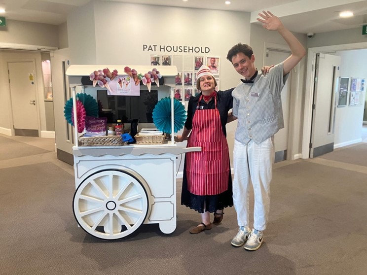 Twice a month Joanna brings a joy trolley decorated in bright colours onto the dementia friendly households. She dresses up as an ice cream vendor, plays music and offers scoops of ice cream to the Residents. Joanna  encourages them to stand in line as if they are queuing  for an ice cream at the seaside. The aim of the activity is to create a real, lived experience and foster memories of being at the seaside.
