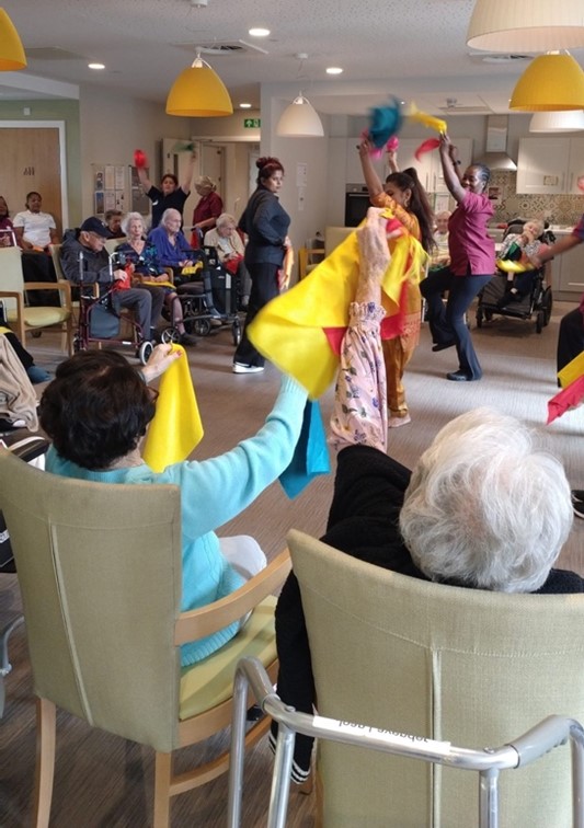 Other activities include Bollywood and Sri Lanka performances and workshops. Some Residents hold instruments and take part as much as they are able to, whilst others hold ribbons and feel the textures. Joanna includes the care team in these activities to feel the experience of joy and happiness the activities generate.