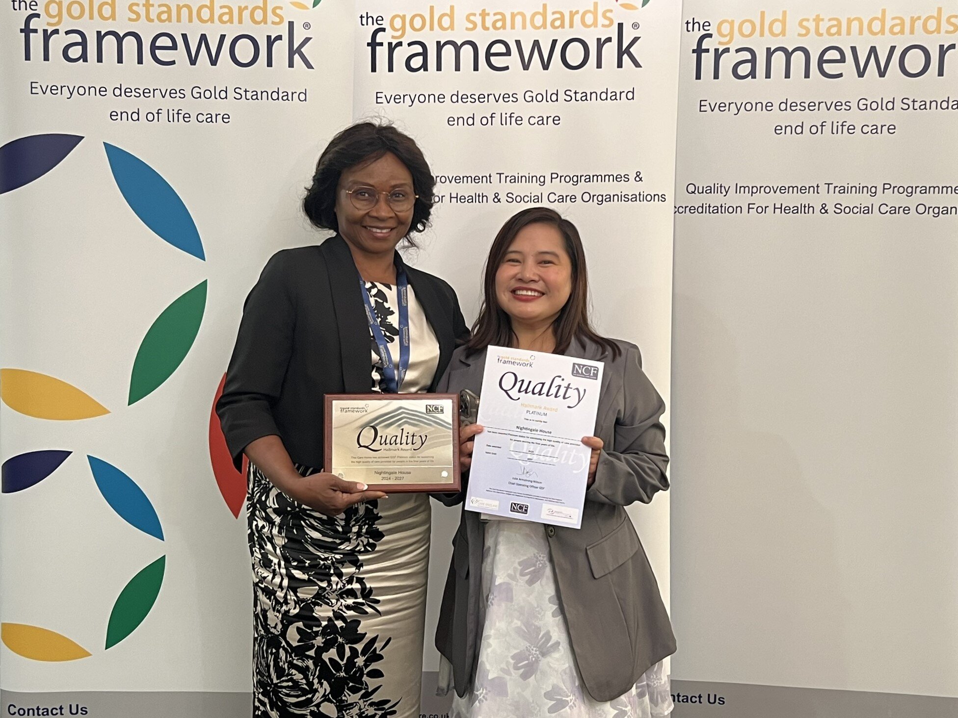 We are thrilled to announce that we have been awarded the Gold Standards Framework (GSF) Quality Hallmark Platinum Award for the outstanding end-of-life care that we provide. In addition, we have also been awarded the Innovation Award for our End-of-Life Care programmes. This recognition is a testament to the dedication of our team, led by Daisy Pillora, who accepted the award on behalf of us along with Chipema Chitambala at the GSF annual conference on Friday, 27th September.