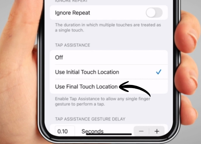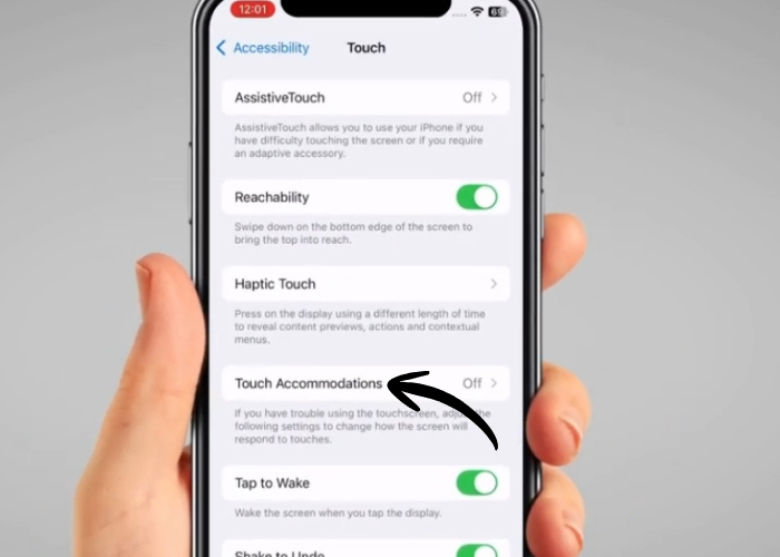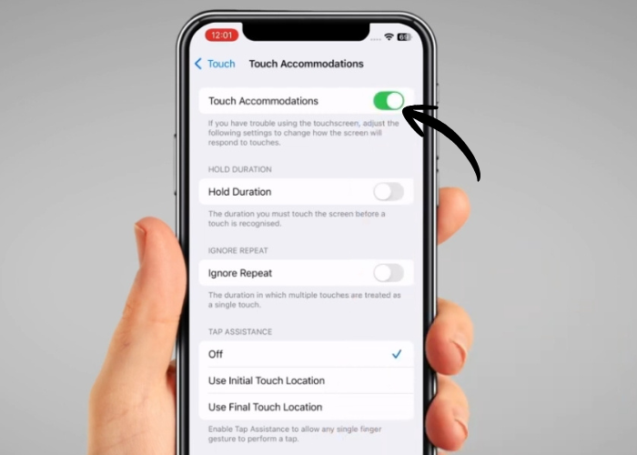 Tap on the switch for ‘Touch Accommodations’ to enable it.