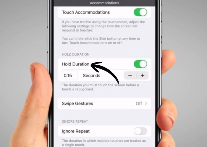 Turn on ‘Hold Duration’ by tapping on the switch. This allows you to modify how long you need to hold down a button to allow an action.