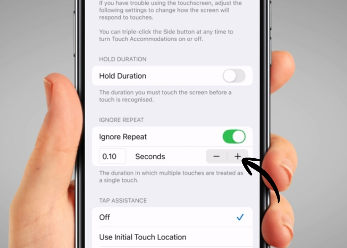 Tap the plus and minus buttons to choose how long your phone should wait before it registers another touch.