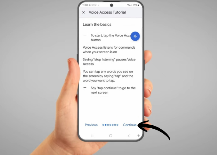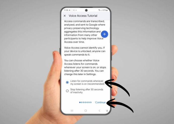 Scroll to the bottom of 'Voice Access Tutorial', select 'Listen for commands whenever my screen is on (recommended)'. This will allow your phone to listen even when you are not actively using it. Tap 'Continue'.