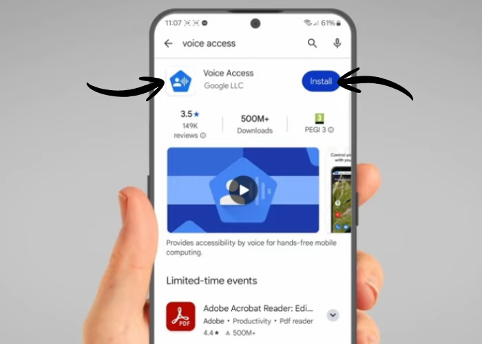 Type 'Voice Access' in the search bar and press search. The app you are looking for looks like this. Click on 'Install' and wait for it to download.