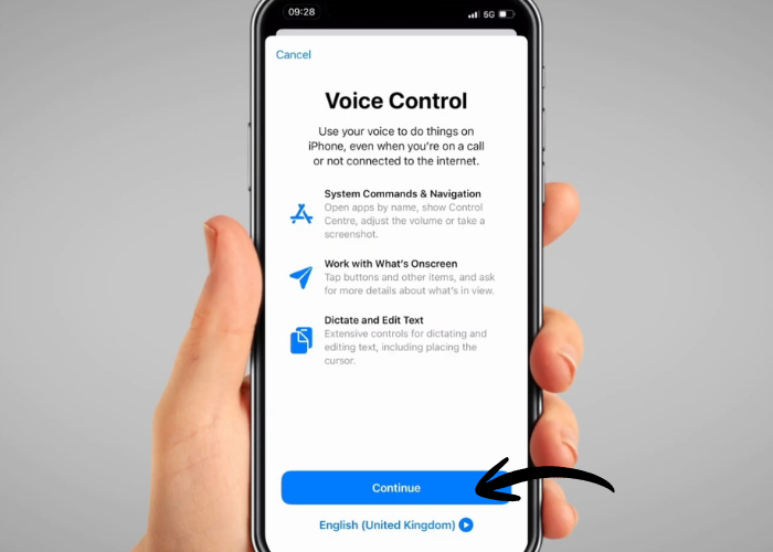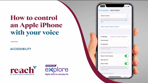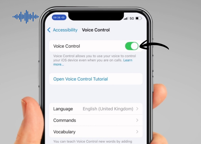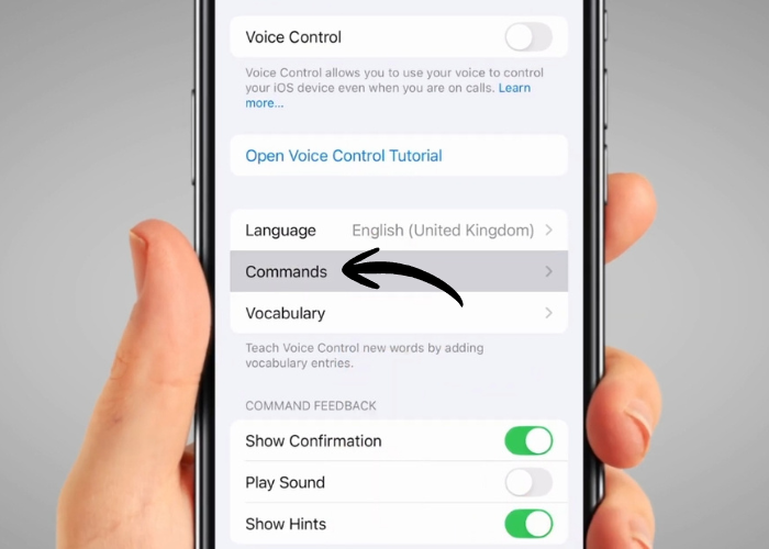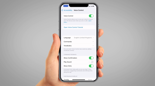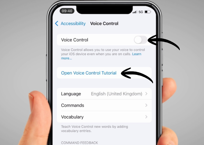 Tap the switch next to ‘Voice Control’. On this page, you can also open the Voice Control tutorial to learn about all the commands you can use.