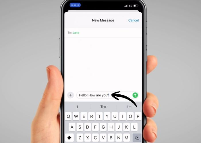 Write the text message by saying, for example, “Hello, exclamation mark, how are you, question mark”.